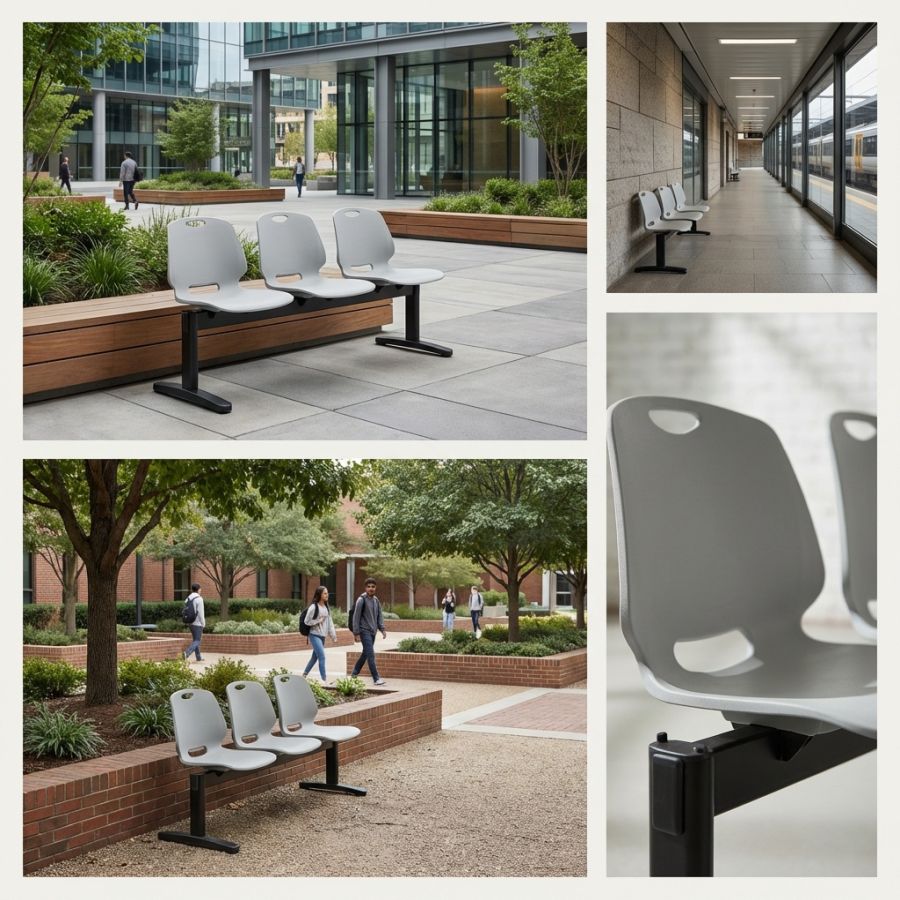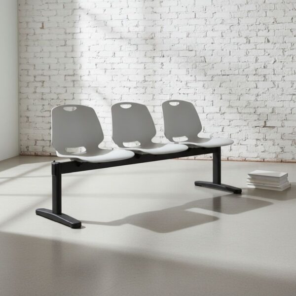 Tough polyprop shell (choice of Black or Light Grey) on epoxy coated steel beam structure in 3, 4 and 5 seater configurations.