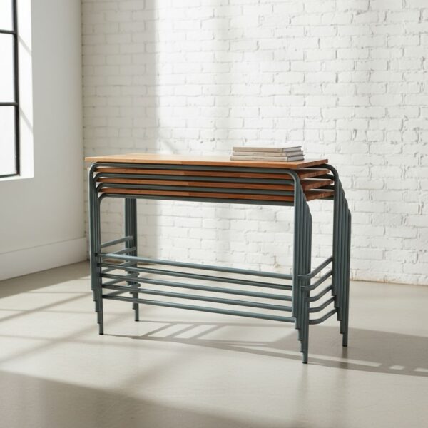 Sturdy table featuring a 25mm round cold-rolled steel frame with a light grey powder-coated finish, complemented by a 22mm Saligna or 16mm Supawood top with a full-length pencil groove for practical, refined workspace detailing.