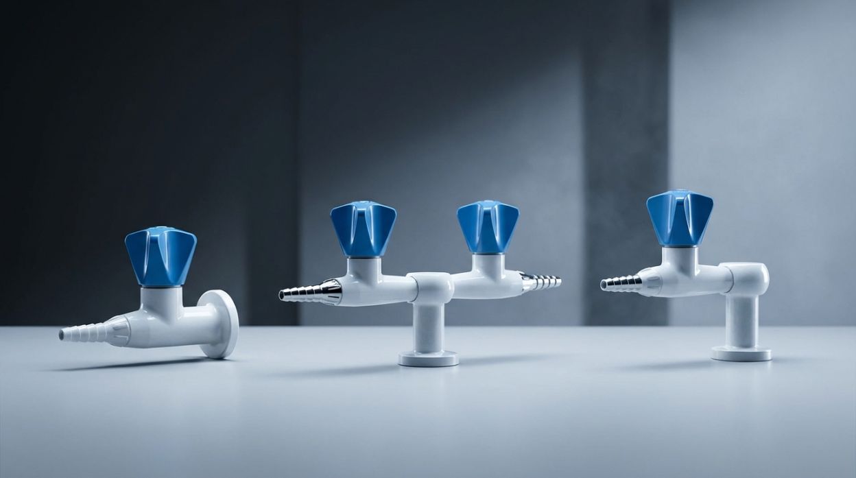 1. Bench mounted valve for Technical gases 2.0 with plastic handle and fixed nozzle.